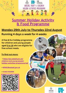 Please see poster below or visit https://go.walsall.gov.uk/children-and-young-people/holiday-activities-programme-haf for more information.