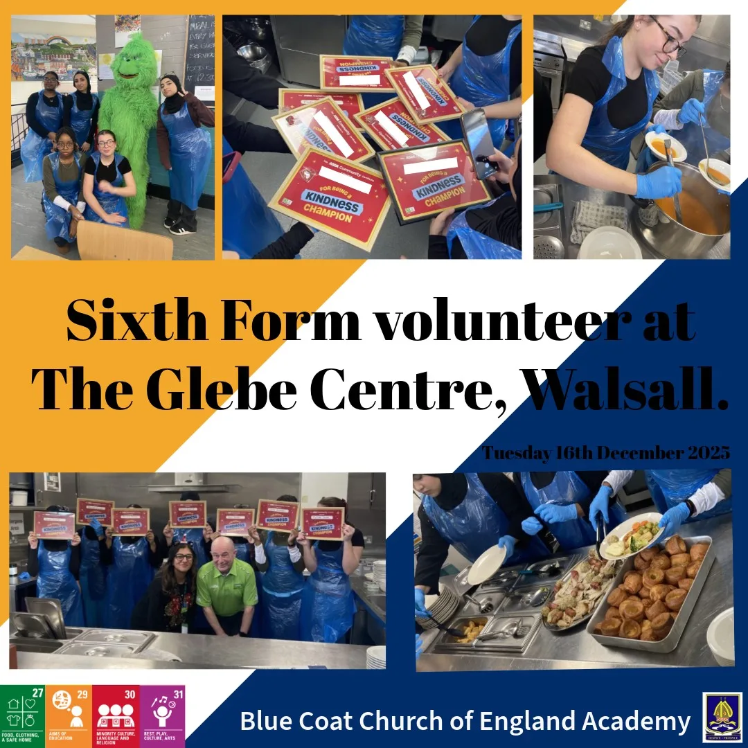On Tuesday 16th December our Sixth form students volunteered at the Glebe Centre in Walsall, supporting Jane from the YMCA and Martin Bateman, Asda’s local Customer and Community Champion . The students prepared and cooked a three-course Christmas meal under the supervision of Martin and our Hospitality Teacher for vulnerable members of our local community. Our pupils gave their time and skills freely to help people that need it, which is fundamental to our Christian values and ethos in the Academy and we could not be prouder of them!