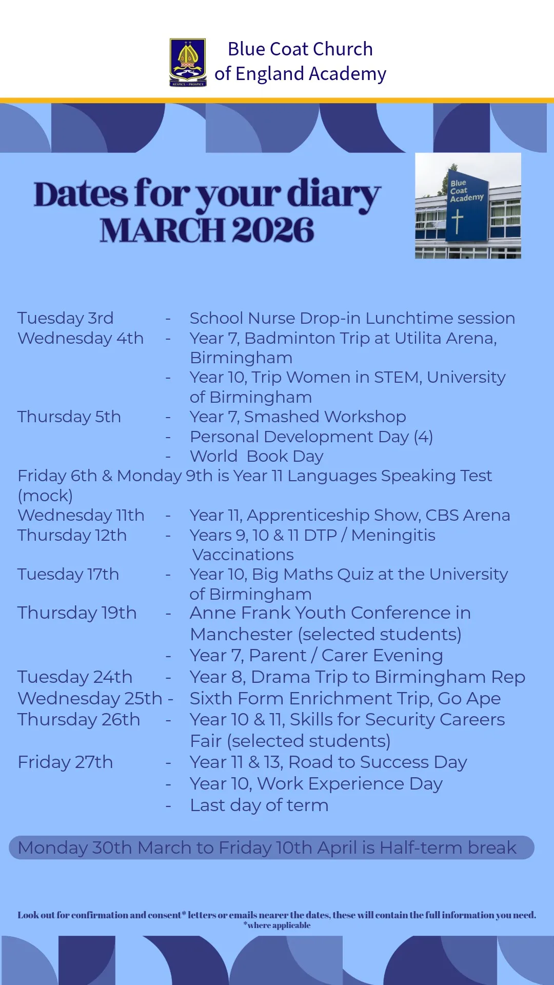 Look out for confirmation and consent* letters or emails nearer the date, these will contain the full information you need.