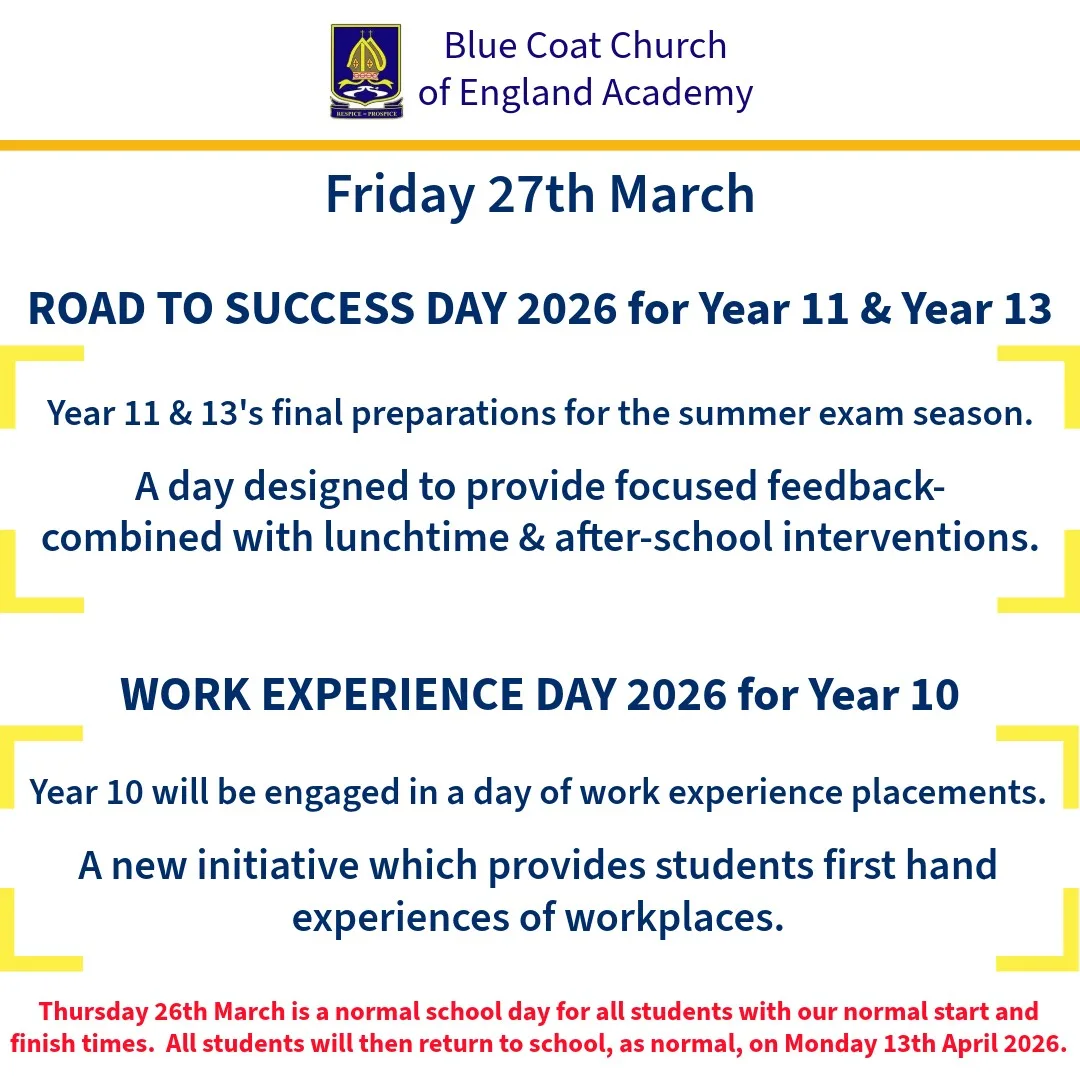 On Friday 27th March 2026, we will be operating different arrangements for years 10, 11 and 13: