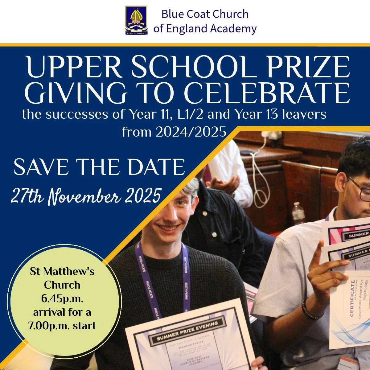 Save the date for Blue Coat Academy’s Upper School Prize Giving Evening, Thursday 25th November 2025.