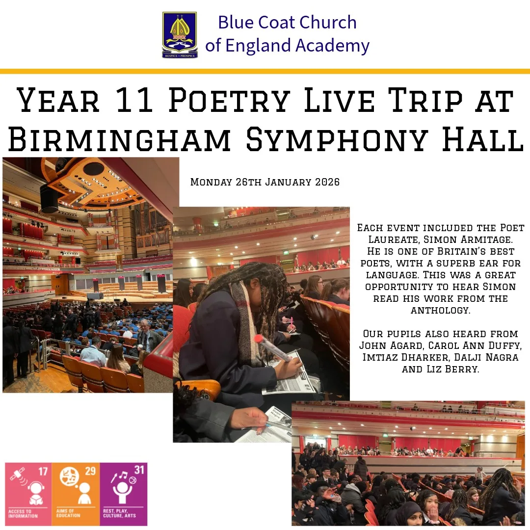 On Monday 26th January, Mrs Alden, accompanied by Miss Salisbury and Mr Hendy, led a trip to Poetry Live at Birmingham’s Symphony Hall for Year 11. They enjoyed several poets reading the poems they are studying for their exam. They even had an Unseen Masterclass led by the chief examiner. A wonderfully academic experience for our dedicated students.