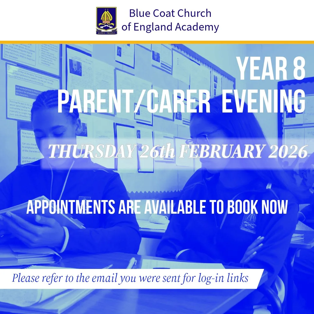 Appointments are now live and will close at 4p.m. today (Wednesday 25th February 2026). Should you wish to make any changes after this time please contact the school office or email us on updatemydata@bluecoatacademy.org.