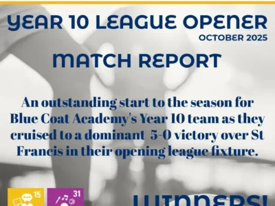 ⚽ MATCH REPORT ⚽ Blue Coat CofE Academy 5 - 0 St FrancisAn outstanding start to the season for Blue Coat CofE Academy’s Year 10 team as they cruised to a dominant 5-0 victory over St Francis in their opening league fixture! 💪🔵⚽️From the first whistle, Blue Coat set the tempo and never looked back — combining solid teamwork, sharp passing, and clinical finishing. Every player played their part in a performance full of energy, discipline, and determination.🔥 A statement win to kick off the campaign. Eyes now on the next challenge!Our pupils that join or set up groups (Right 15) and partake in play of any kind (Right 31) are aligning with the UNICEF Rights of the Child and are supported by staff in doing this, thank you to the PE department for helping the pupils get off to a super strong start this