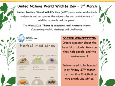 United Nations World Wildlife Day (WWD) is celebrated every year on 3 March to celebrate wild animals and plants and recognise the unique roles and contributions of wildlife to people and the planet.The WWD2026 Theme is Medicinal and Aromatic Plants: Conserving Health, Heritage and Livelihoods.“People everywhere rely on wildlife and biodiversity-based resources to meet our needs - from food, to fuel, medicines, housing, and clothing. For us to enjoy the benefits and the beauty that nature brings us and our planet, people have been working together to make sure ecosystems are able to thrive and plant and animal species are able to exist for future generations. So, let’s celebrate wildlife and the important conservation work being done around the world!"As such, Mrs Virk as lead of the Eco-Committee, has asked pupils to create a poster about the benefits of plants. All entries will need to be submitted by 27th March 2026 to Mrs Virk (Room 8) or Miss Smith (LRC