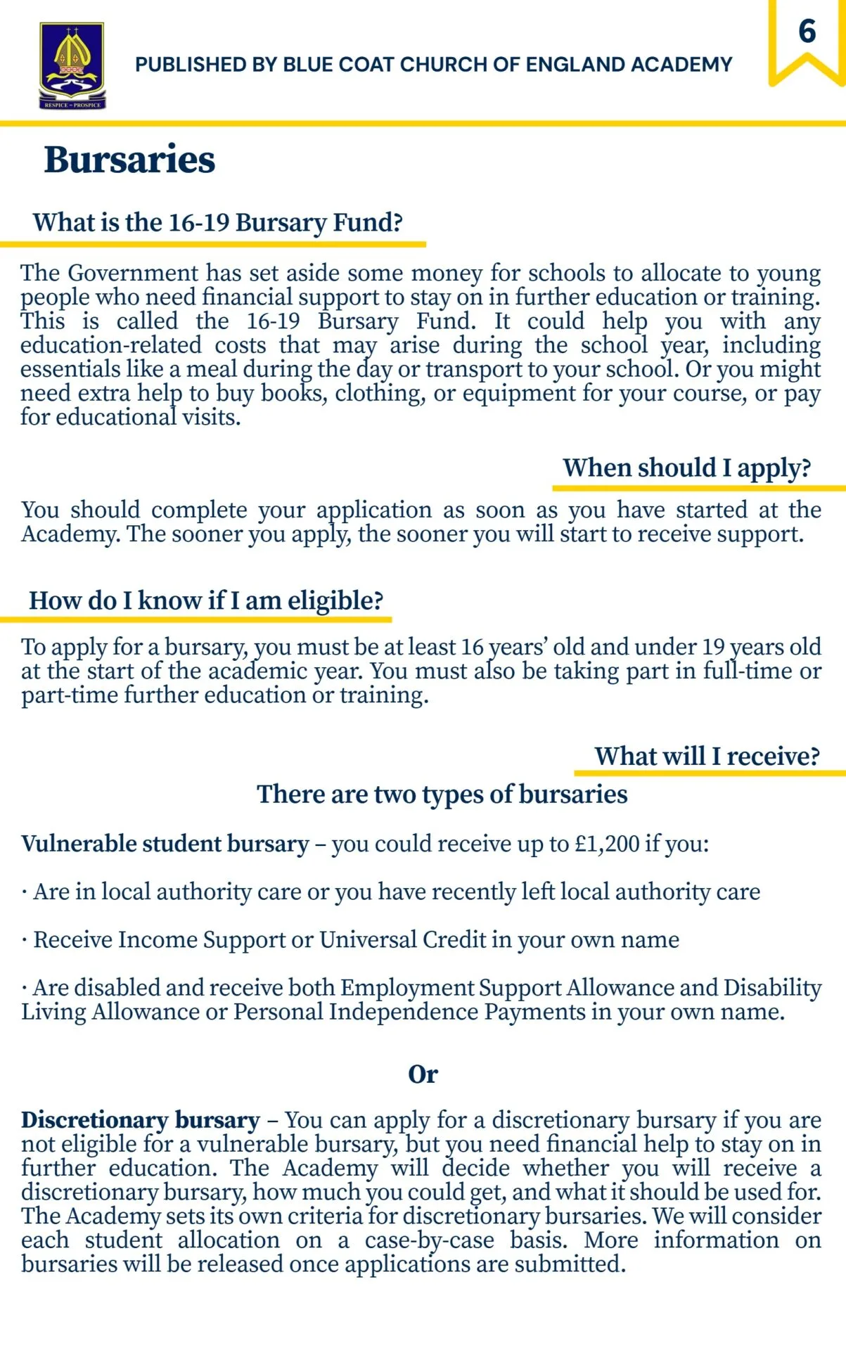 If you need to apply for a bursary, please read B16+ Student Guide first. This will tell you everything you need to know about the application process and how to submit requests.